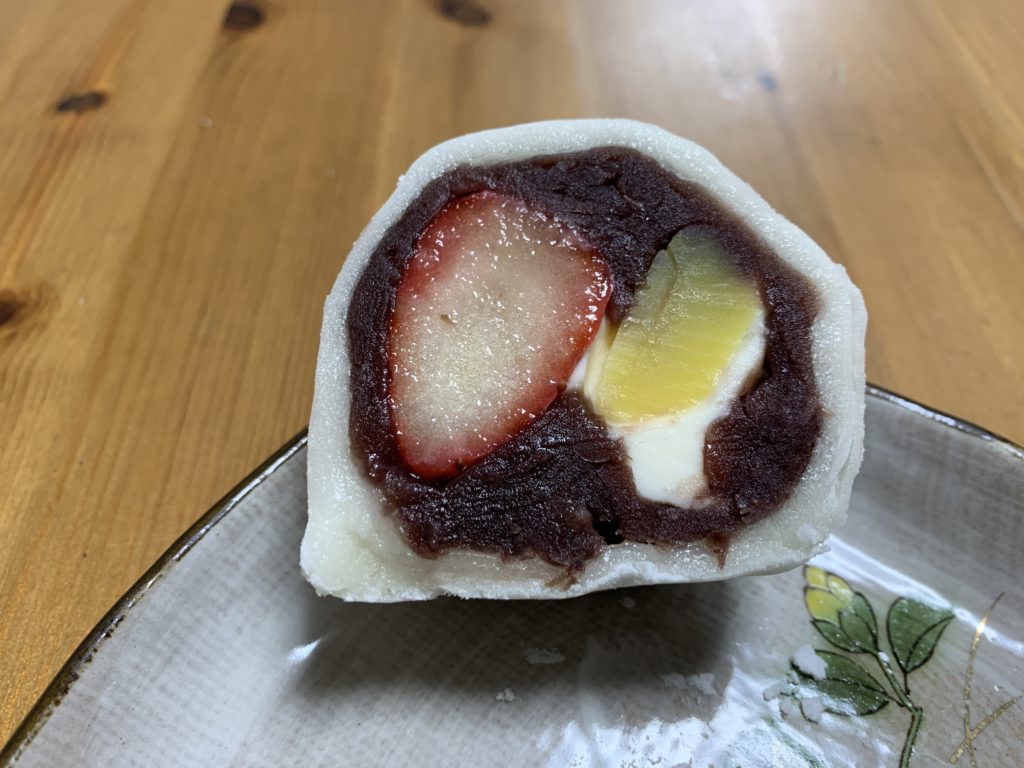 普段甘いものを食べないので、1/4サイズで充分なのですが、いちご、栗、クリームチーズとアンコと、名前通り不思議な大福を頂きました。