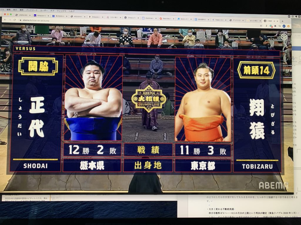 夕方17:00、気分がソワソワしてきました。時津風部屋の正代関と翔猿との一番があります。正代がこれに勝てば優勝!ワクワクします。