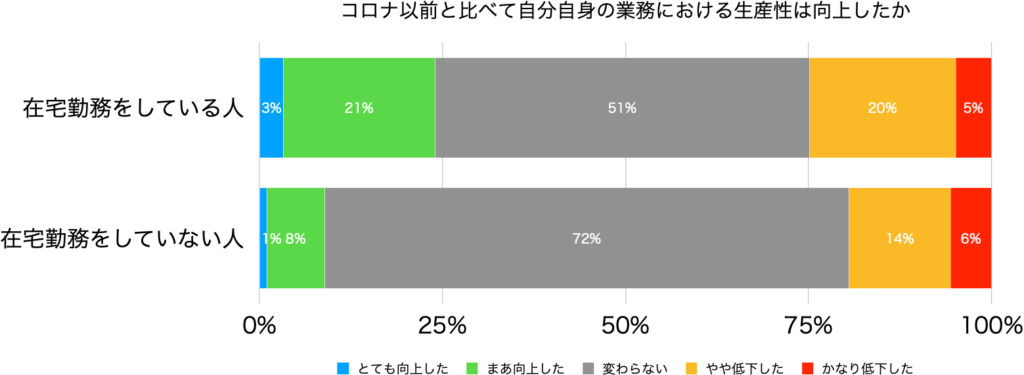 在宅勤務をしている人としていない人に、コロナ前と比較して生産性は向上したのかアンケートをとったところ、「在宅勤務をしている人」の24%が「生産性が向上した」と回答しています。