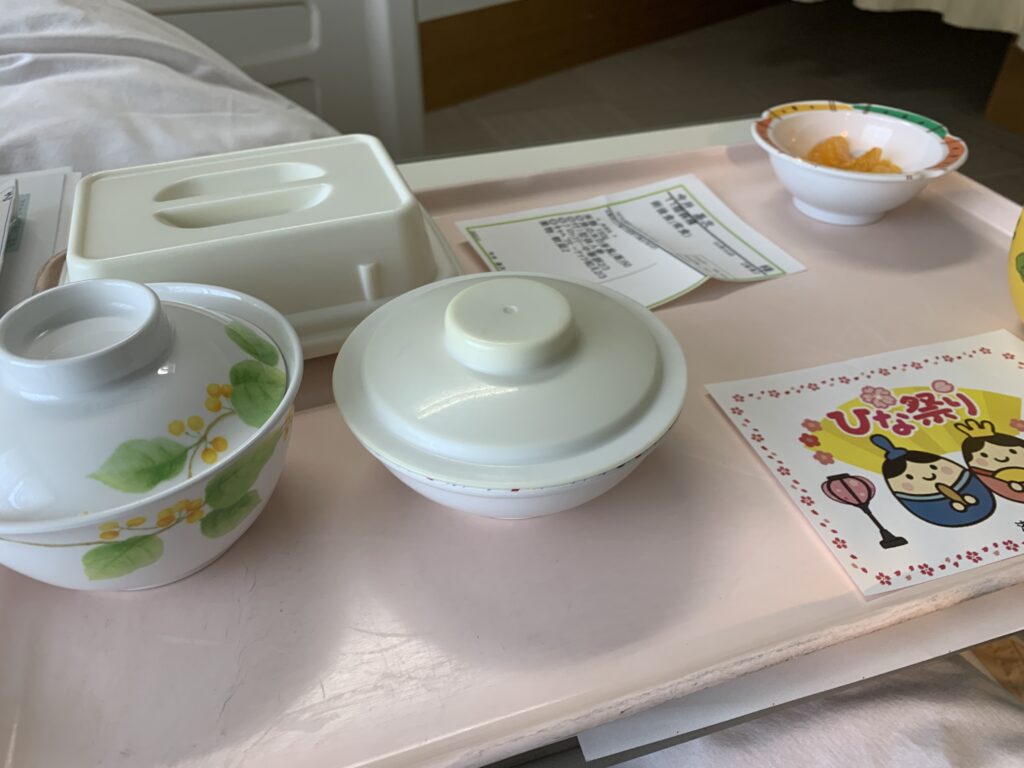 人生初尿瓶も、経験して、相変わらずの自分のタンクの大きさにうっとりしてしまいます。そしてようやく食べ物と水を飲める瞬間がやってきました。なんと、今日はひな祭り。オカユと思っていたら…