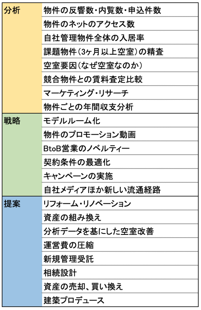 業務内容のデータをまとめていくと、不思議なことにどの規模の会社であっても同じ問題が浮き彫りになります。それは、社員が目の前の仕事や突発的なクレームに追われて一日を終えてしまっている、という問題です。確かに業務は回っていますが、これでは「業績が上がらない」という悩みは解決しません。管理会社が本来時間を費やすべき「分析・戦略・提案」という3つの柱(図1)が大きく欠けてしまっているのですから、当然のことです。