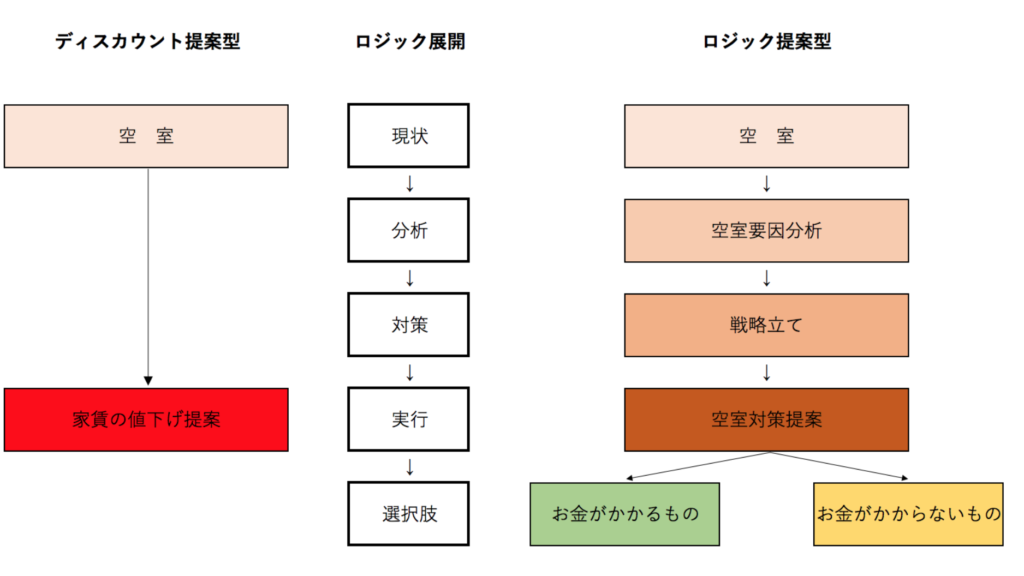 今、なぜ空室になっていて、その原因となっているものは何なのかをよく考えなければいけない。空室要因には「内部環境(物件自体の問題)」、「外部環境(物件を取り巻く市場)」、「管理会社」、「オーナー」と、大きく4つのカテゴリーがある。一つの要因に「なぜそうなのか」を繰り返していくとロジックツリー(展開)が出来上がる(なぜなぜ分析)。例えば、「物件の共用部が汚い」という問題があったとする。これに「それはなぜか?」という問いを繰り返していくと、共用部が汚い→以前から汚れている→定期清掃をしていない→お金がかかる→オーナーが費用を出さない→よって内見がなく決まらない、となる。このように「なぜなぜ分析」を用いて問題を掘り下げていくと根本の課題が見えてくる。もちろん要因はひとつではないため、いくつかの枝になっていくため、それぞれの要因の根本を突き詰めなければ問題解決に至らないことが多いが、管理会社として提案にロジックが足りていないと考えられる場合には、「なぜなぜ分析」を用いて問題の根本を探して欲しい。