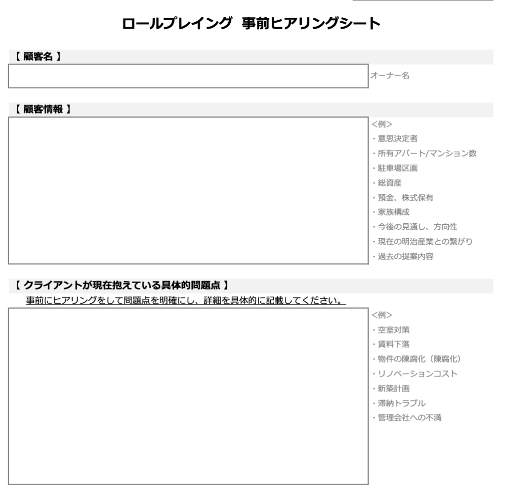 まず、現実性のあるロールプレイングでなければ、緊張感がうまれず、ただ時間を無駄に使うことになってしまう。営業機会を最大限成果に結びつけるための予行演習なのだから、事前準備こそ重要であり、それを怠ってはならない。そこで現実性をもたせるために、「事前ヒアリングシート」を作成して、営業マンは実際に提案をするオーナーの顧客情報を埋めて行く。現状の問題点、改善しなければならない理由と背景、いつまでにその改善が必要かなど、現時点でわかっている内容を埋めていく。ロールプレイングでは、オーナー役となる人に事前にこのシートに目を通してもらい、オーナーになりきって演じてもらう必要がある。これくらいの事前準備は、1時間程度あれば埋められるので必ず行う。