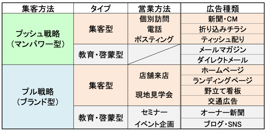 集客方法には、「プッシュ戦略(マンパワー型)」と「プル戦略(ブランド戦略)」の2種類の方法があります。プッシュ戦略とは、企業が顧客に対して商品を売り込む方法で、「訪問営業」「電話営業」「ポスティング」などがそれにあたります。マンパワーに頼るため、1人の営業マンが顧客との結びつきを強められるものの、同時に多数の接点をつくることが難しいのが特徴です。特にポスティングは、マンパワーを使ってチラシを撒いたのに、そこからの反響率は1/10000程度で、工数のほとんどを無駄にしていることになります。一方、プル戦略とは、顧客自らを動かし引き込む方法で、自社商品の魅力を伝えるだけでなく、顧客にとって有用な情報を提供します。例えば「セミナー」「見学会」などのイベント開催がそれにあたりますが、一つのアクション(イベント)に対して、一挙に多数の顧客と接点をつくることができます。仮にすぐに成果にいたらなくとも、継続してイベント開催をすることで、徐々にファン層が広がり、顧客を囲い込むことができます。そこがプル戦略の大きなメリットです。集客方法について、それぞれの特性はありますが、ただ売り込むだけの営業ではなく、顧客目線に立った情報提供や提案ができるのかがポイントです。