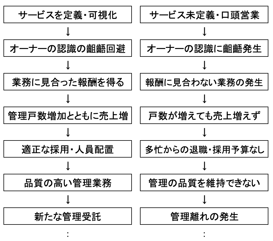 こんな例があります。ある管理会社が管理料を3〜6%に定めて管理受託を行なっていました。しかし、同社は自社の提供する管理内容を定義していなかったため、オーナーには「管理をさせてください」と言うだけで、詳細な説明なしに管理を受託します。オーナーとの交渉が難航した時は管理料を3%にし、スムーズな時は6%で契約します。管理戸数は順調に伸びていきましたが——、さて皆さん、この会社は数年後、どんな状況になったと想像しますか?