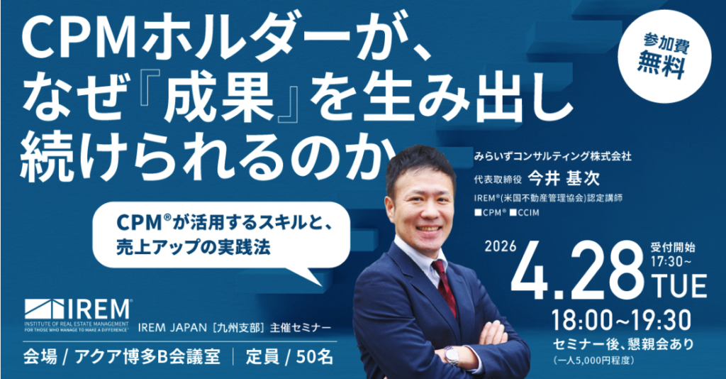 2026年4月28日(火)に福岡県(アクア博多)にて開催される、一般社団法人 IREM JAPAN 九州支部様主催の特別セミナーにて、弊社代表取締役の今井 基次が講師として登壇いたします。